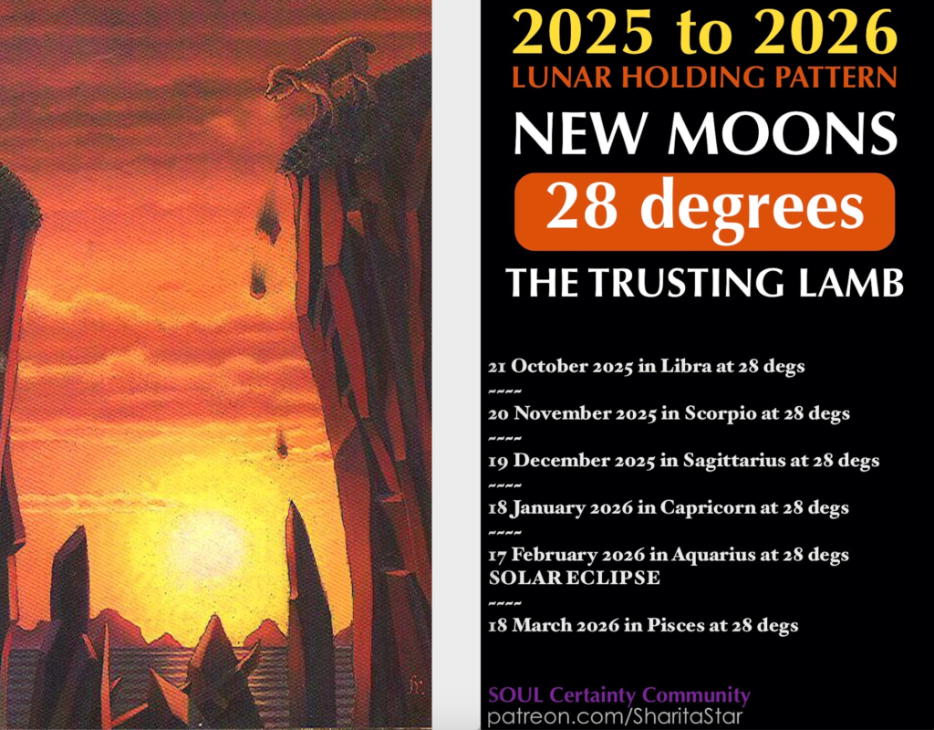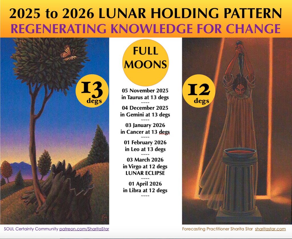 Our current Annual Holding Pattern began in Autumn 2025. All New Moons align at 28 degrees from Libra to Pisces spanning October 2025 to March 2026. All Full Moons align at 13 or 12 degrees from Taurus to Libra spanning November 2025 to April 2026.